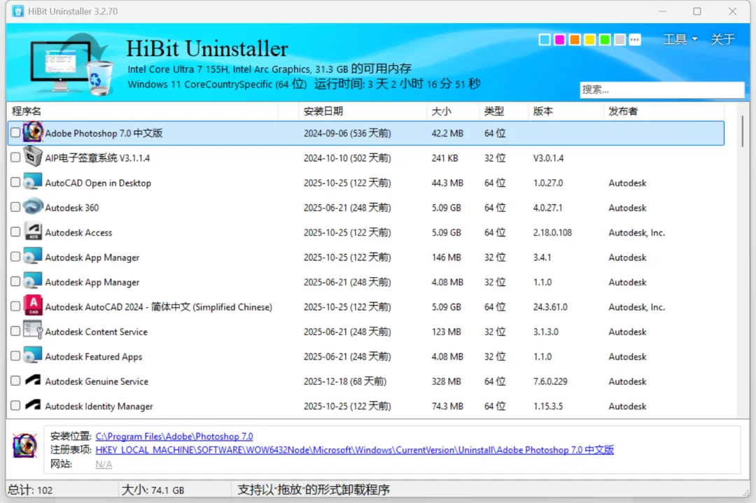 下面介绍一款强大的免费软件卸载工具,能够彻底移除顽固软件、清理残留文件和注册表项。支持批量卸载、强制卸载、Windows应用商店应用管理和浏览器扩展清理,让您的电脑系统保持最佳状态。轻量级设计,仅4MB大小,安装过程以秒计算,可以说是秒安装,功能全面强大。