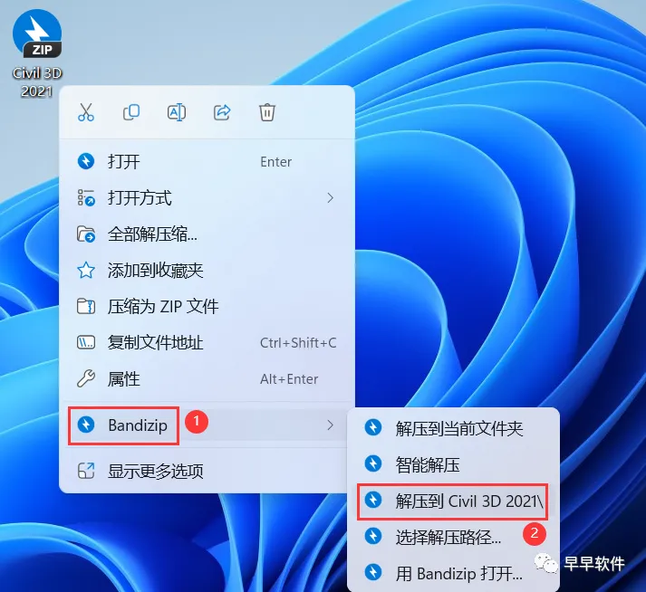1、下载Civil 3D 2021软件安装包到电脑上,右键选择【解压到Civil 3D 2021\】