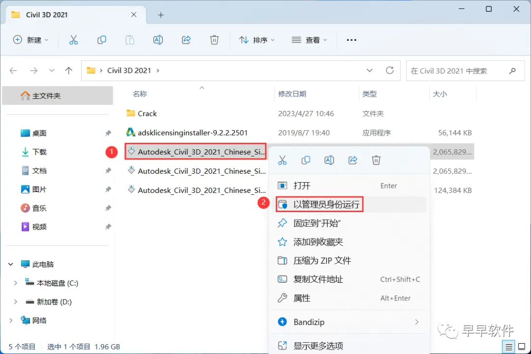 11、回到Civil 3D 2021文件夹,找到【adsklicensinginstaller…】程序,右键选择【以管理员身份运行】它