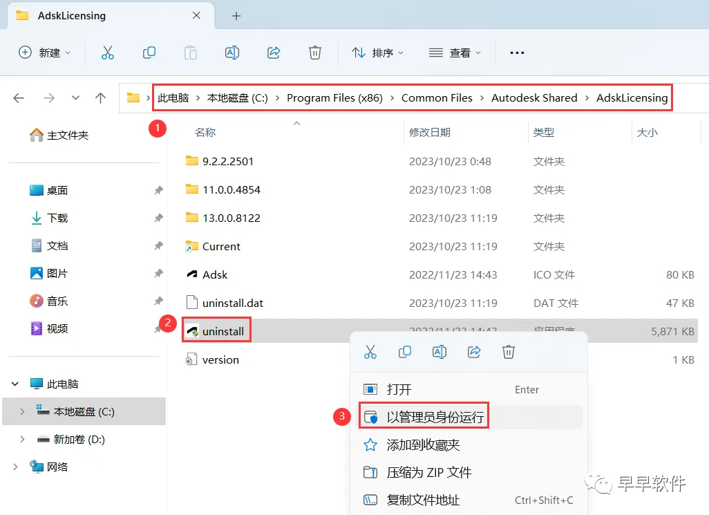 10、打开路径:C:\Program Files (x86)\Common Files\Autodesk Shared\AdskLicensing,找到【uninstall】程序,右键选择【以管理员身份运行】它