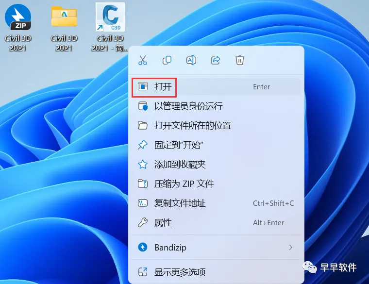 13、回到桌面,右键桌面上的【Civil 3D 2021软件图标】,点击【打开】
