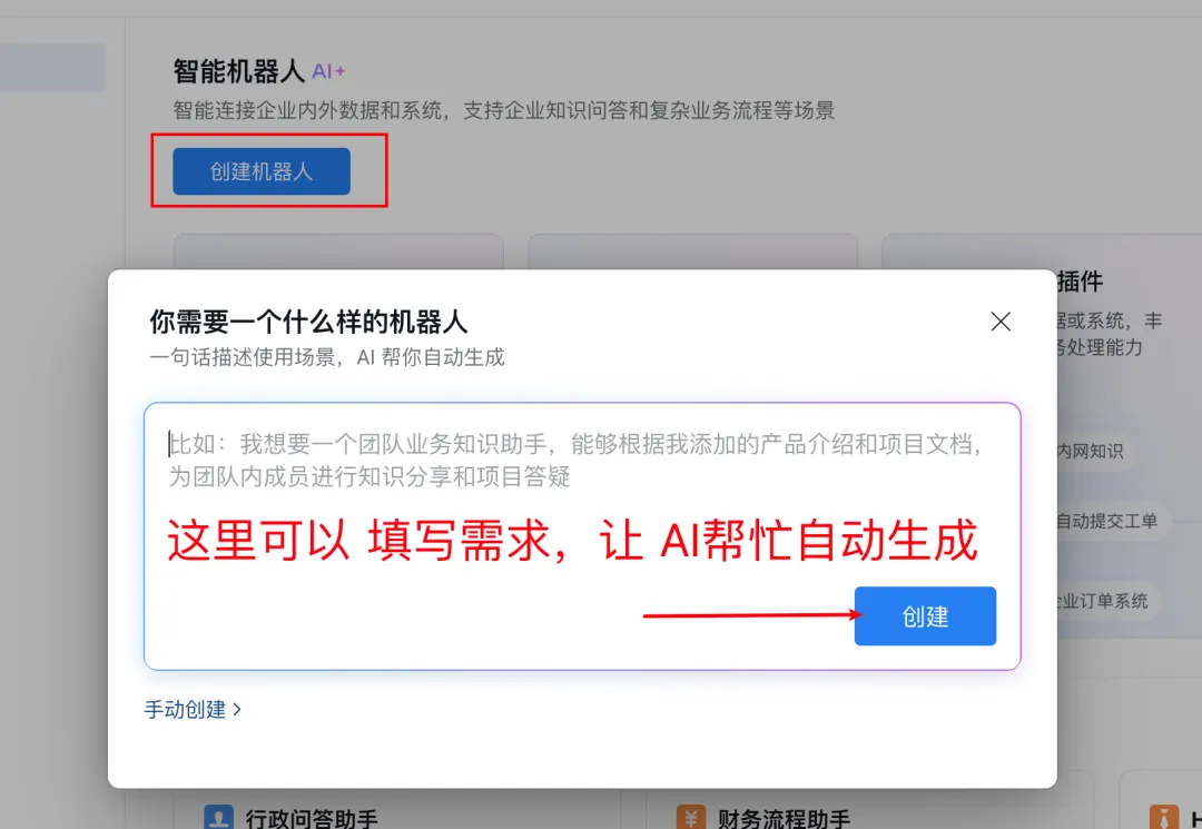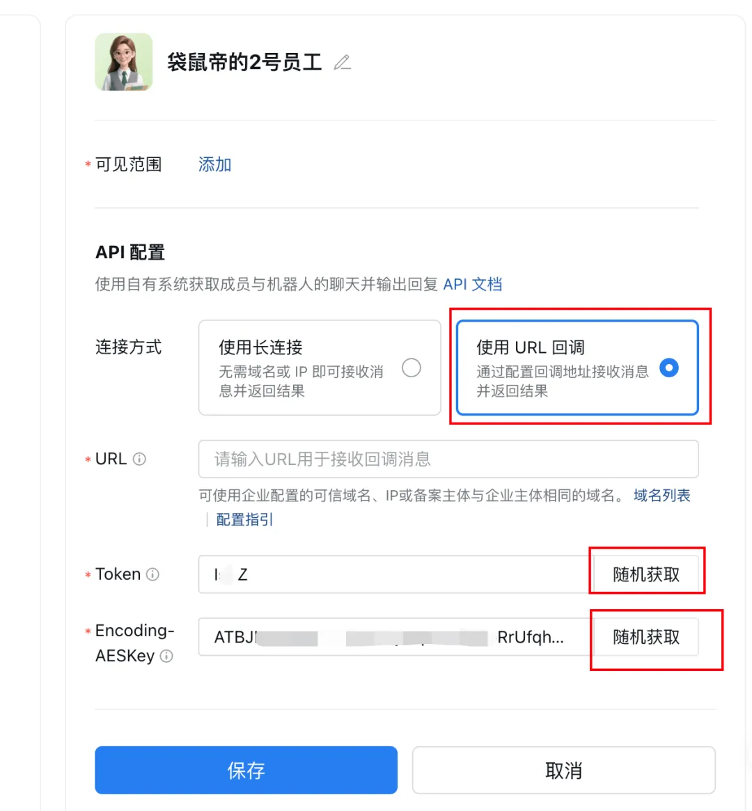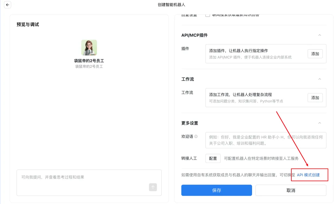 我们先就只设置一下机器人的名称、简介,然后拉到底部,切换至API模式创建。