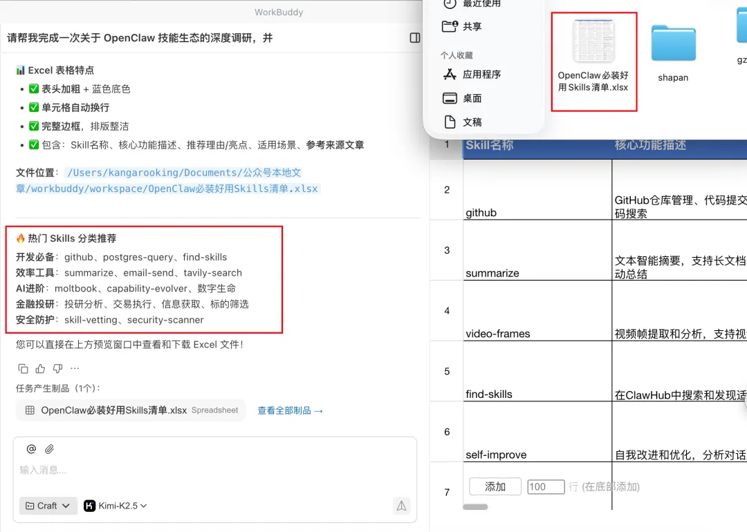 Excel表格化:激活xlsx技能,将提取到的信息整理成一个名为《OpenClaw必装好用Skills清单》的表格。