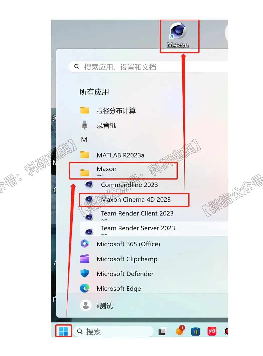 9.如果桌面没有自动生成软件图标的话,点击桌面左下方开始,选择所有应用,找到“Maxon”文件夹,拖动软件到桌面即可