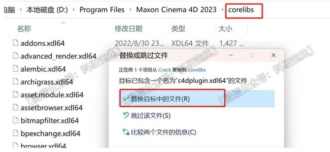 12.找到“corelibs”文件夹,打开,在空白处将第10步复制的文件粘贴过来,点击“替换目标中的文件”