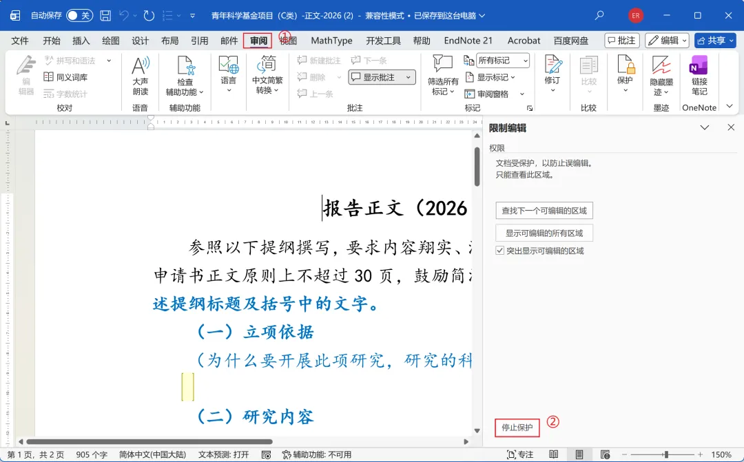 打开国自然Word模板,依次单击顶部菜单栏的【审阅】→【限制编辑】(部分版本显示为“保护文档”),在右侧弹出的窗格中,点击下方的【停止保护】按钮(图2)。如果提示输入密码,直接留空或点击确定即可(模板通常未设密码)。