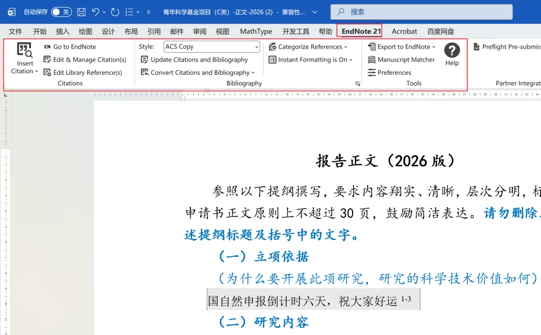 插入文献:光标停留在“立项依据”部分末尾,正常插入参考文献。此时参考文献列表就会出现在立项依据后面、研究内容之前。