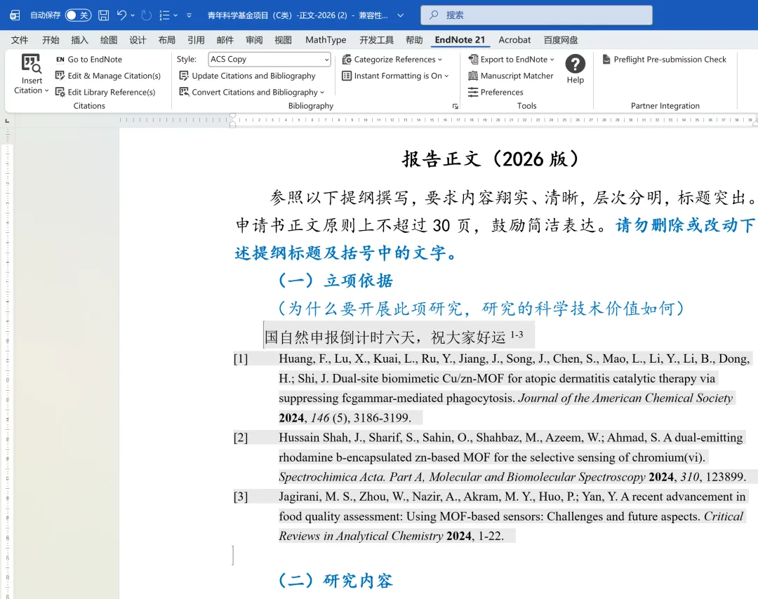 首先,我们需要了解问题的根源。国家自然科学基金的电子版申请书中,为了保持格式统一,禁用了word的一些功能,这就导致Endnote、医学文献王等文献管理软件无法直接在模板中对参考文献进行编辑。这并非你的操作有问题,而是模板本身的限制。