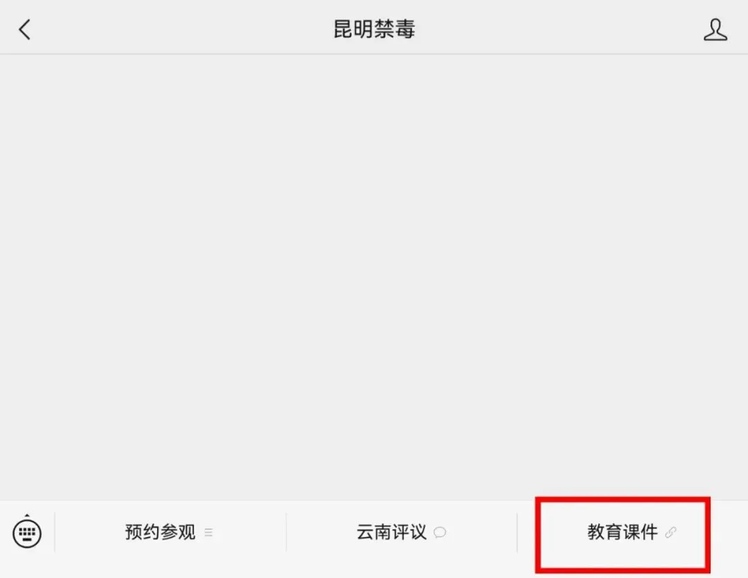 2、进入“昆明禁毒”微信公众号微信对话框,点击菜单“教育课件”。