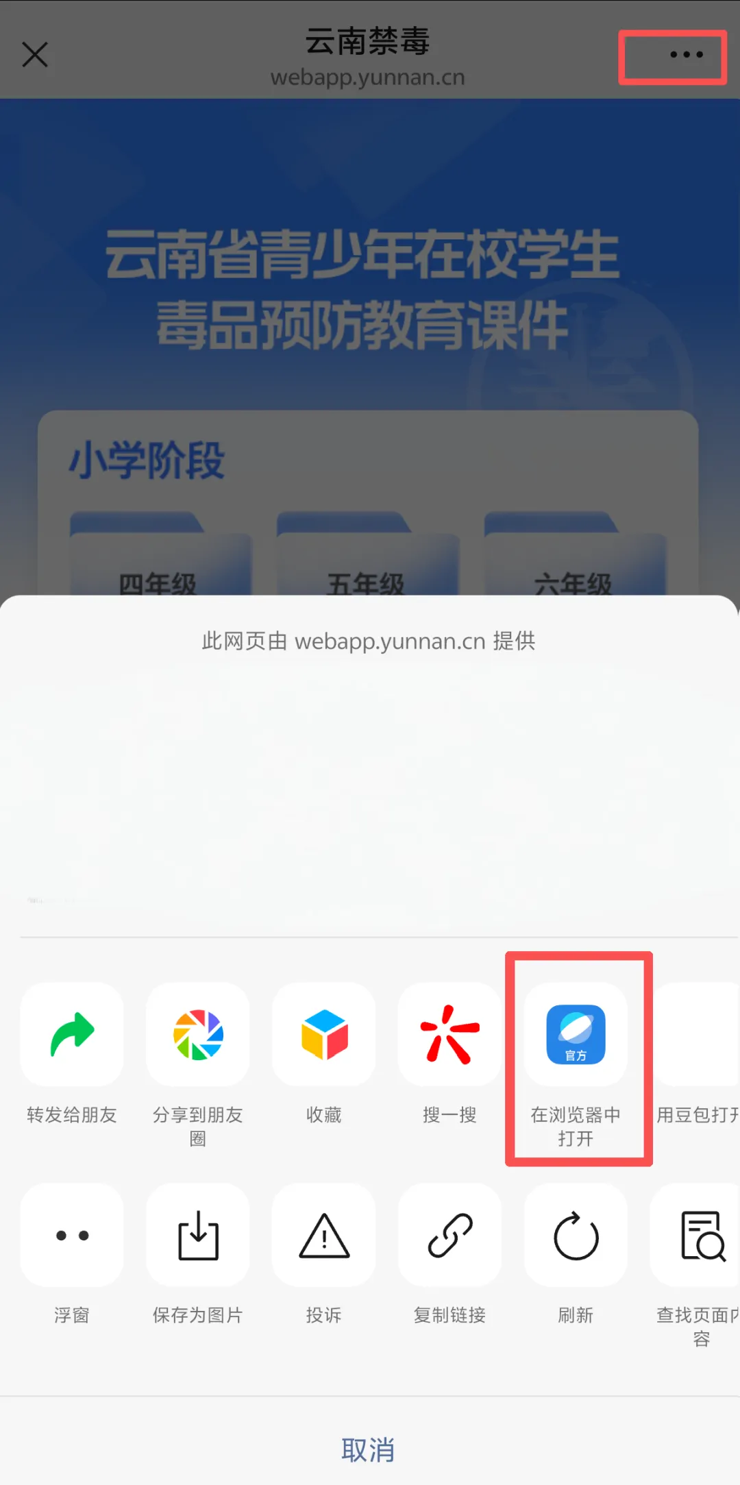 3、进入“云南省青少年在校学生毒品预防教育课件”页面,点击对应学段即可下载。