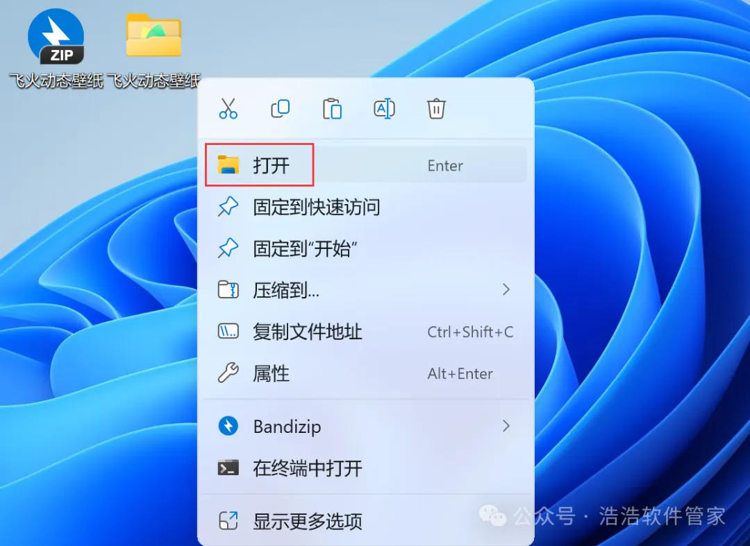 8、回到桌面,右键桌面上的【飞火动态壁纸软件图标】,点击【打开】