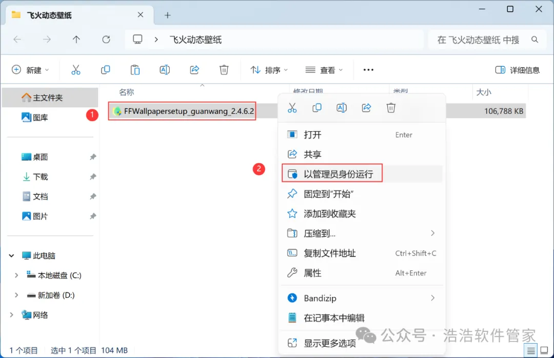 3、找到【飞火动态壁纸】应用程序,右键选择【以管理员身份运行】它