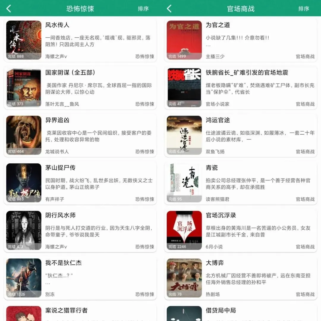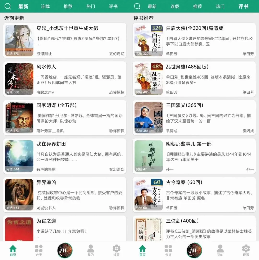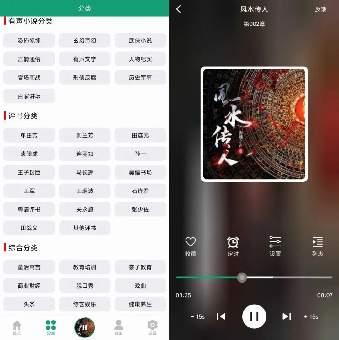 在分类页各种有声资源分类非常的详细:有声小说分类,综合分类和评书分类,每个分类下又包含了不同题材的有声内容,完结资源、连载资源一应俱全。