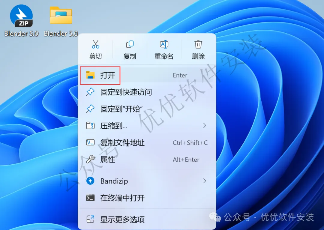 9、回到桌面,右键桌面上的【Blender 5.0软件图标】,点击【打开】