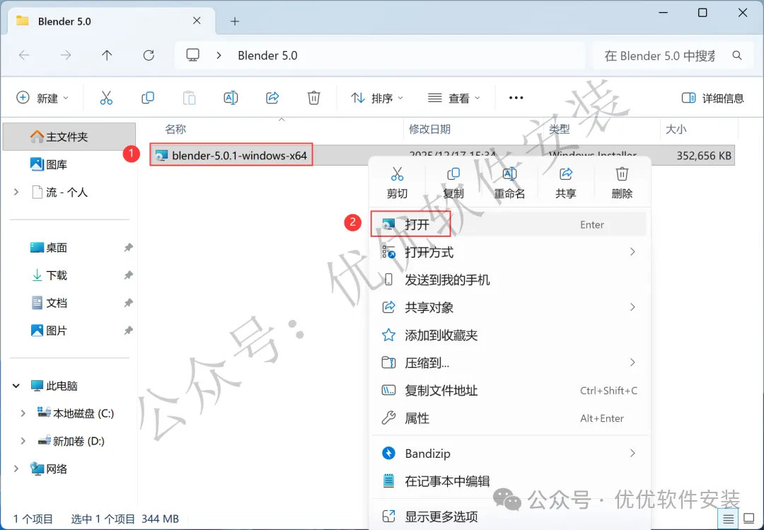 3、找到【blender-5.0.1-windows-x64】程序,右键点击【打开】