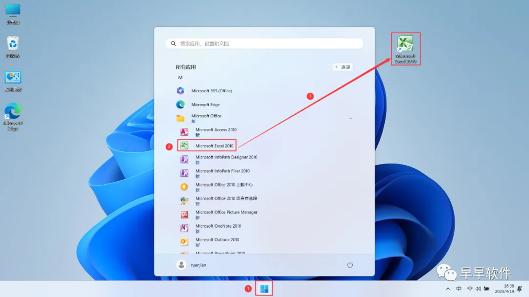 15、回到桌面,点击任务栏的【开始菜单】,在【所有应用】中找到【Microsoft Excel 2010软件图标】,将软件图标拖到桌面上,完成软件桌面快捷方式的创建;PowerPoint 2010和Word 2010创建桌面快捷方式也是一样操作