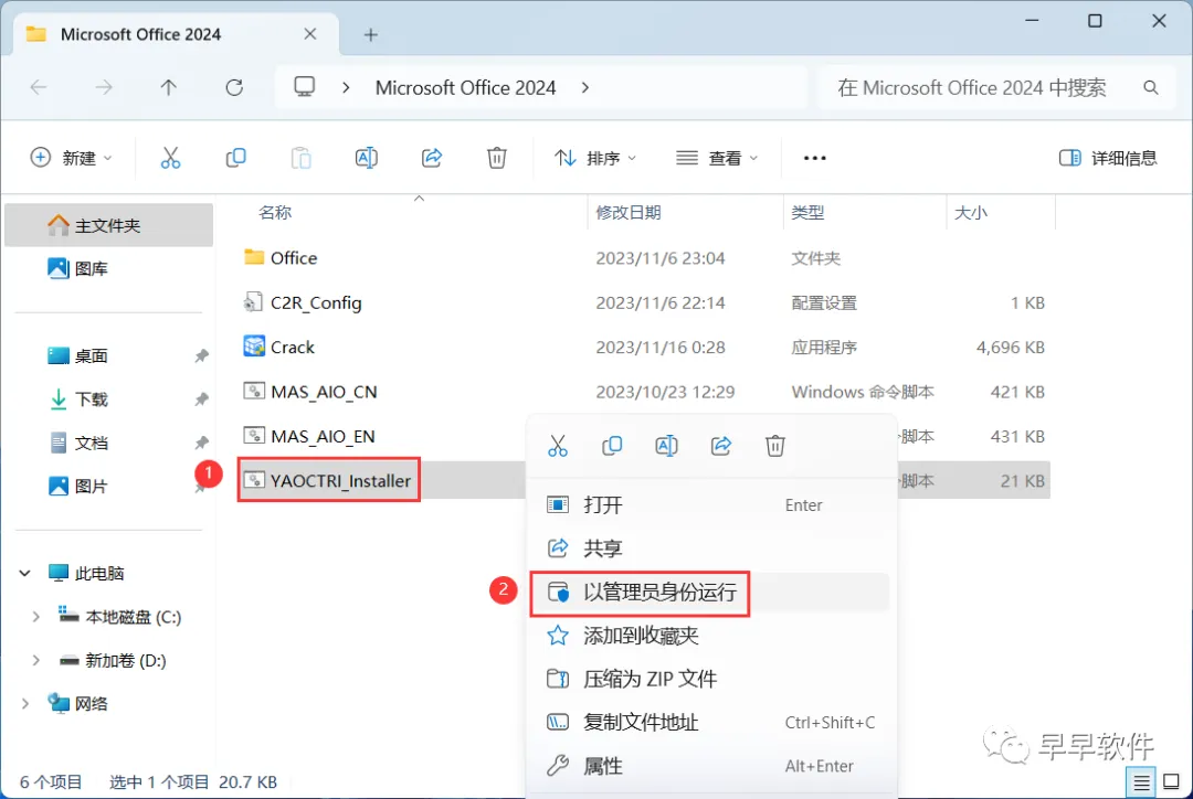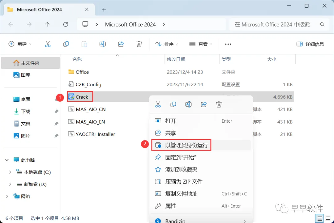 8、回到Microsoft Office 2024文件夹,找到【Crack】应用程序,右键选择【以管理员身份运行】它