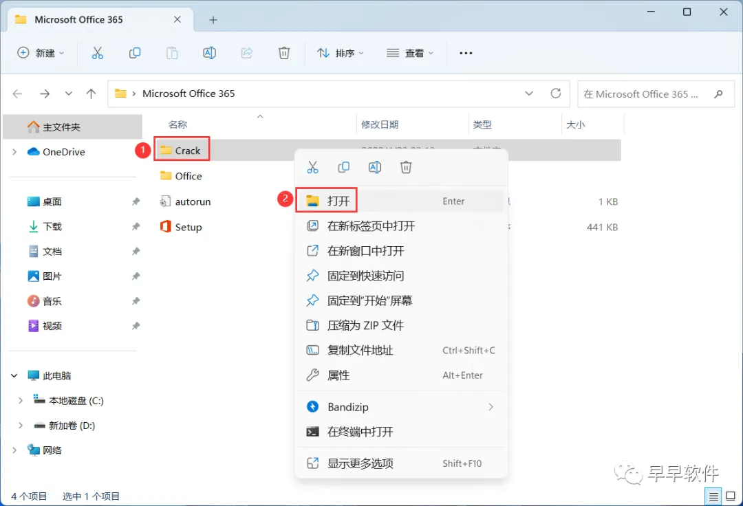 6、回到Microsoft Office 365文件夹,找到【Crack】文件夹,右键【打开】它