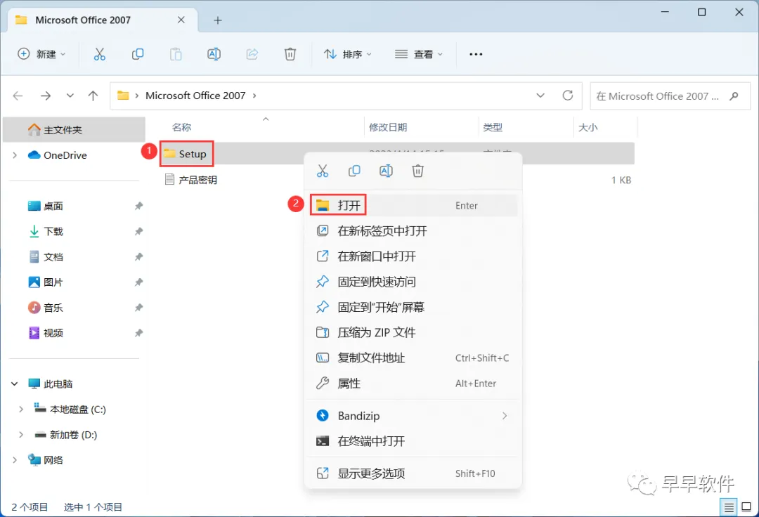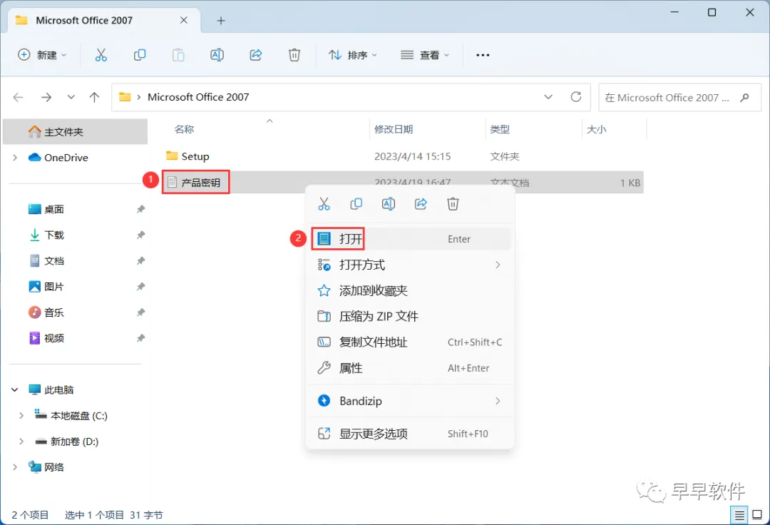 5、回到Microsoft Office 2007文件夹,找到【产品密钥】文档,右键【打开】它