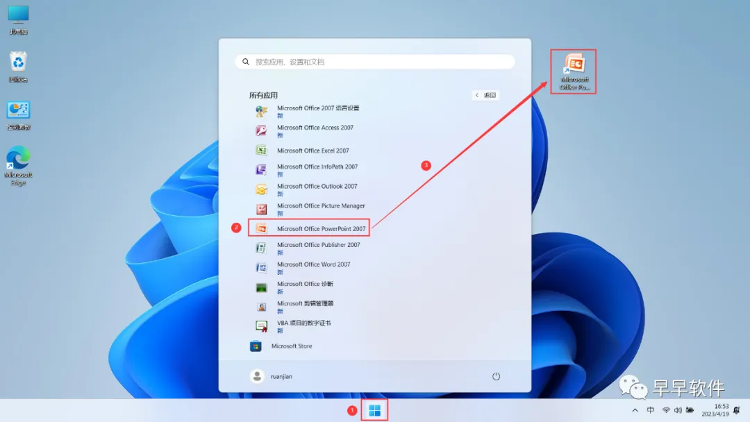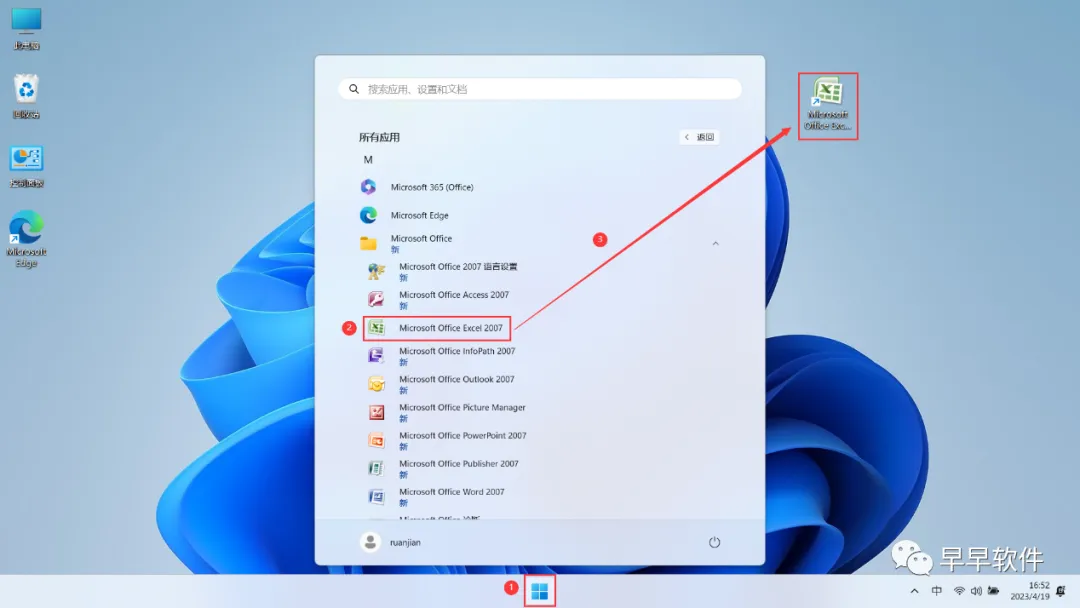 13、回到桌面,点击任务栏的【开始菜单】,在【所有应用】中找到【Microsoft Excel 2007软件图标】,将软件图标拖到桌面上,完成软件桌面快捷方式的创建;PowerPoint 2007和Word 2007创建桌面快捷方式也是一样操作
