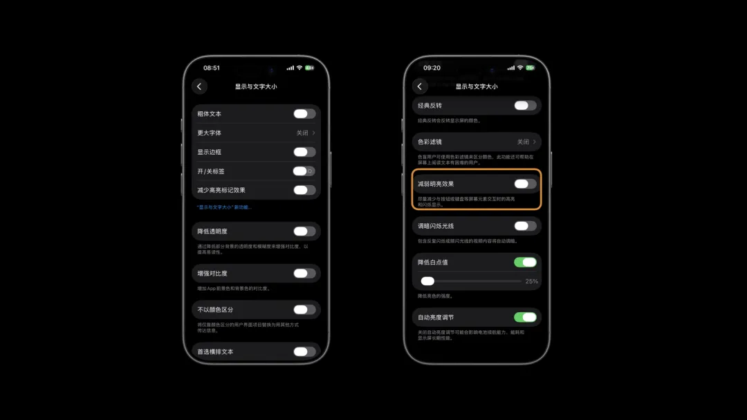 在「设置_辅助功能_显示与文字大小」 页面,苹果将「减少高亮标记效果」更名为「减弱明亮效果」,并新增了功能说明:开启此功能后,系统会尽量减少与按钮、键盘等屏幕元素交互时的高亮与闪烁效果。