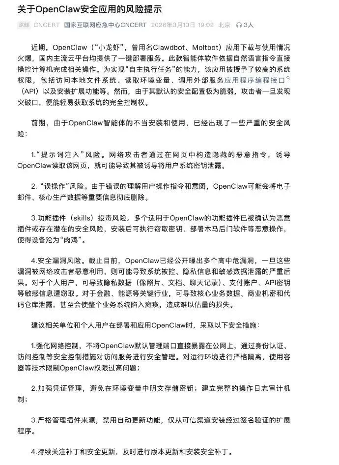 3月10日,国家互联网应急中心正式发布OpenClaw安全风险警示,明确指出这款俗称“龙虾”的开源AI智能体因默认配置高危漏洞和权限失控问题,已出现“提示词注入”、“误操作”、功能插件(skills)投毒、安全漏洞等风险。
