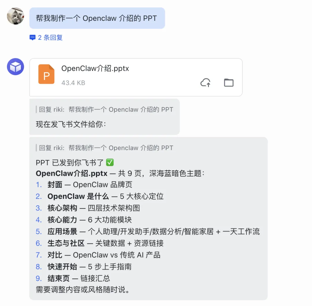 直接下达指令,短时间内就能生成并发送 PPT,常用场景全部封装好,无需调教。