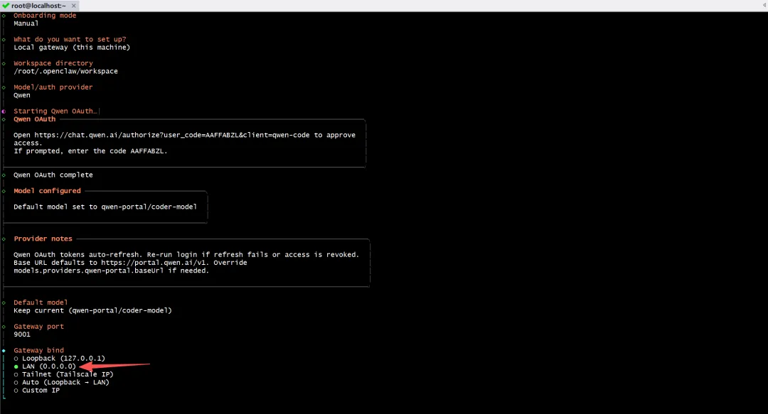 LAN (0.0.0.0),允许局域网访问Gateway auth:选择
