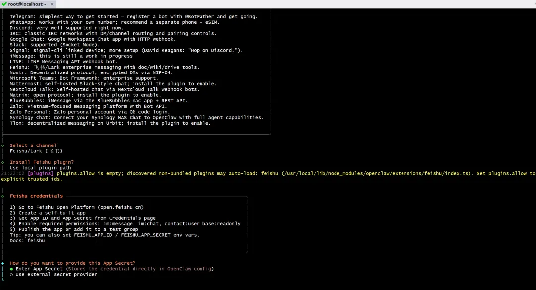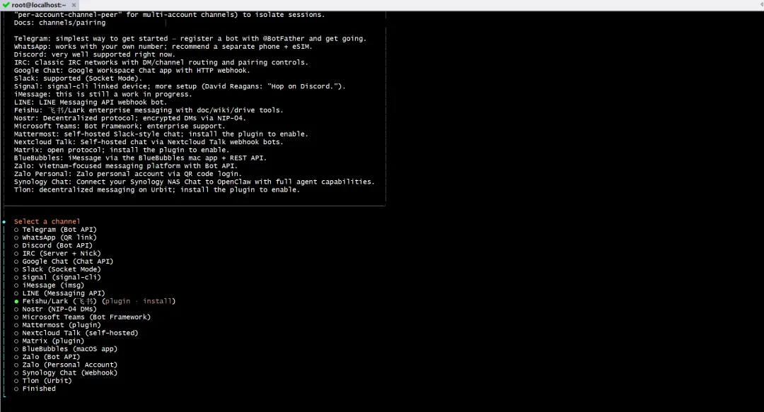 选择你想要接入的平台,例如飞书:Feishu/Lark(👩💻)