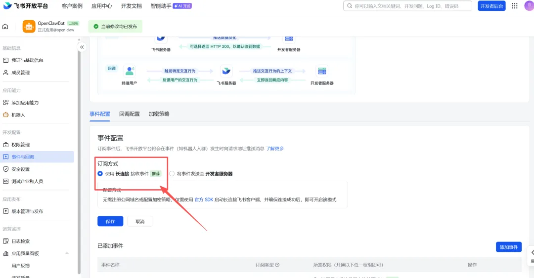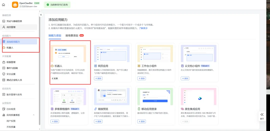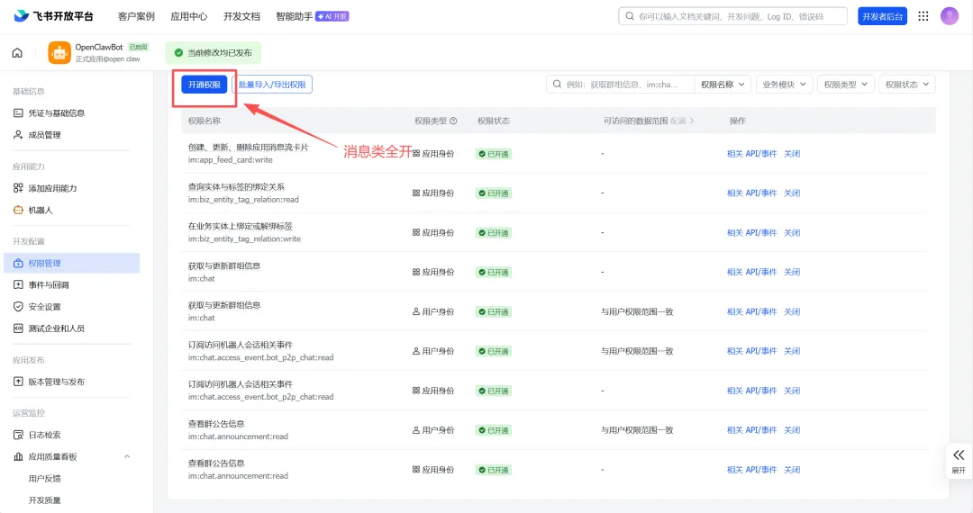飞书应用权限配置:在飞书开放平台的应用中,需要开启以下权限:
