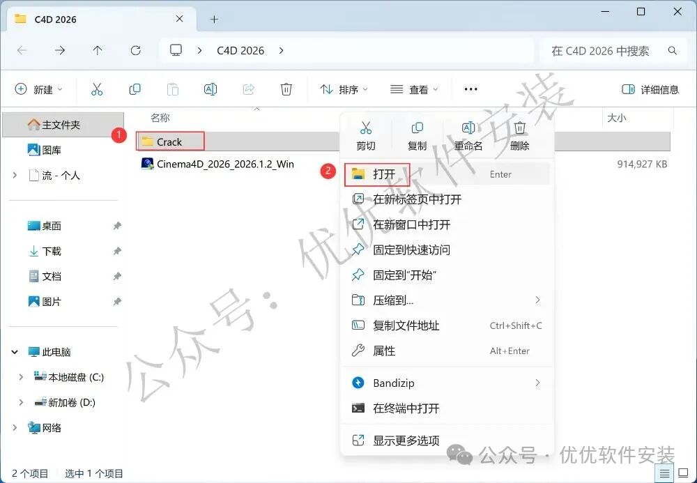 11、回到C4D 2026文件夹,找到【Crack】文件夹,右键【打开】它