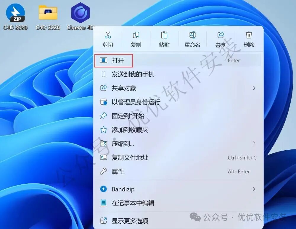 17、回到桌面,右键桌面上的【C4D 2026软件图标】,点击【打开】