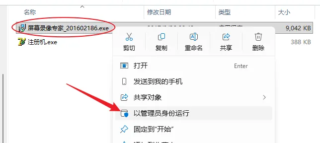 3.选中【屏幕录像专家_201602186】,鼠标右击选择【以管理的身份运行】。