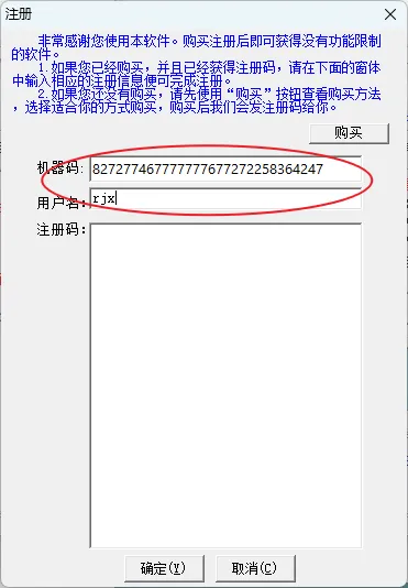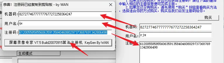 22.把软件【机器码】和【用户名】分别复制到注册机对应的【机器码】和【用户名】中,然后点击【屏幕录像专家V7.5算法注册机】,出现激活码后,把注册机中的【注册码】复制粘贴到软件中的【注册码】中。最后点击【确定】。
