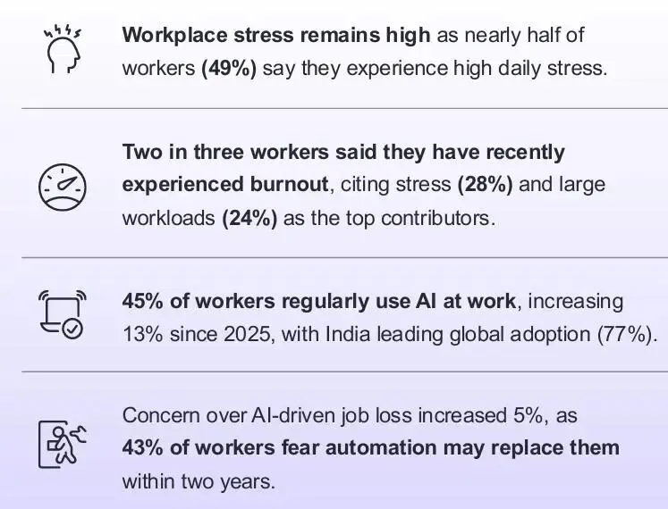 Manpower Group发布的《2026全球人才晴雨表》显示,过去一年,定期使用AI的打工人同比增长了13个百分点,达到45%。