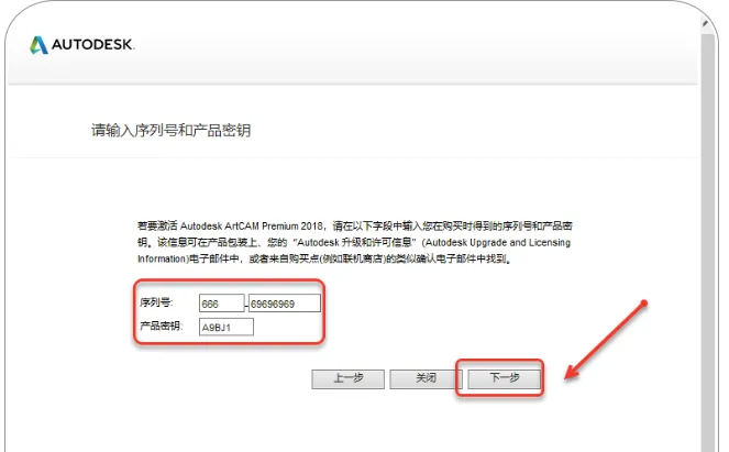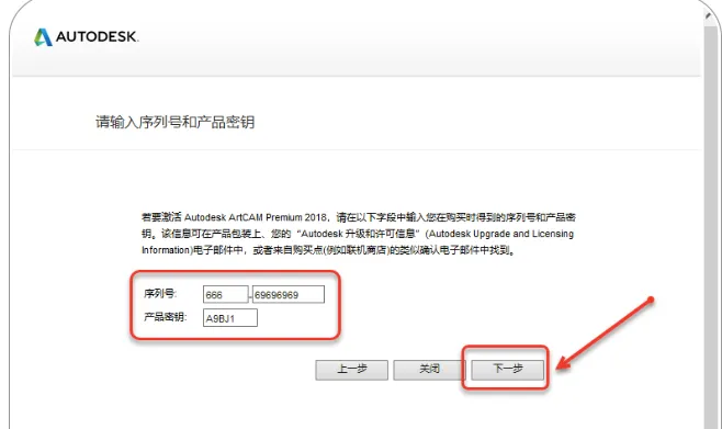 12.输入序列号【666-69696969】,输入产品密钥【A9BJ1】,点击【下一步】。