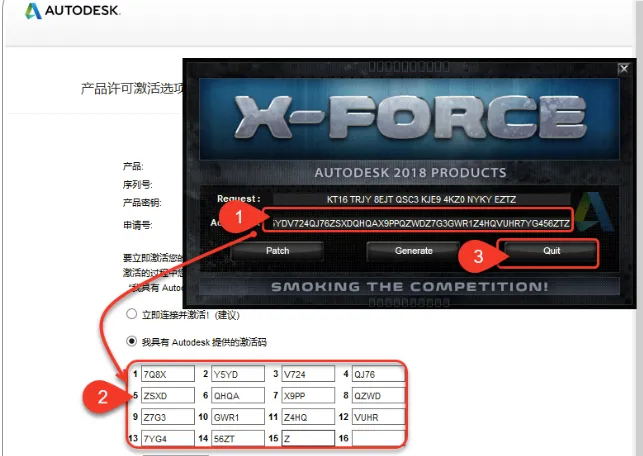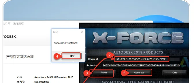 19.生成激活码:①使用快捷键“Ctrl+C”复制【申请号】后的代码;②使用快捷键“Ctrl+V”将代码粘贴到【Request】后的框中;③点击【Patch】;④点击【确定】;⑤点击【Generate】生成激活码。