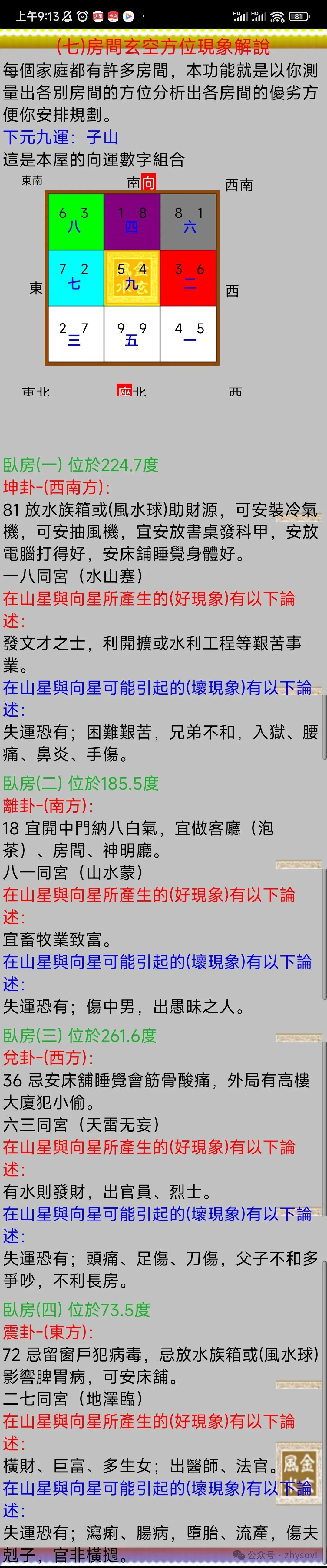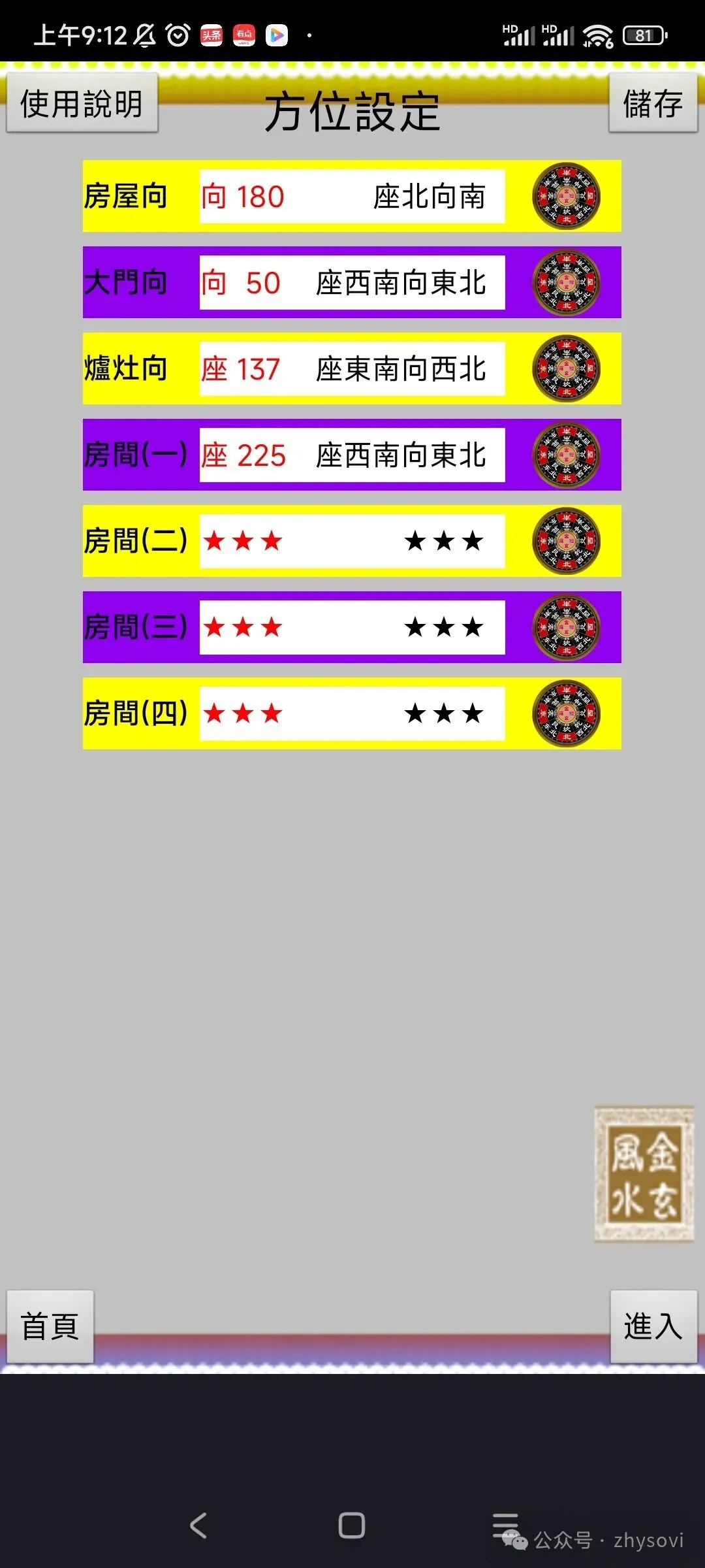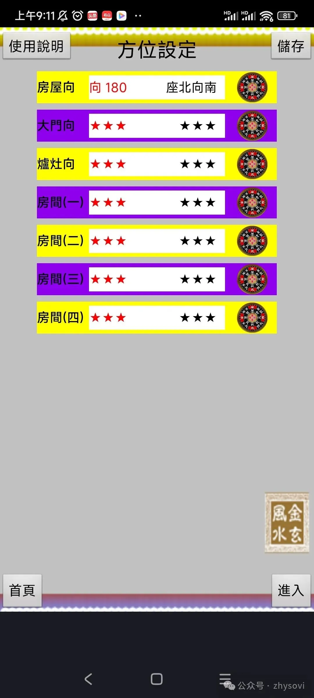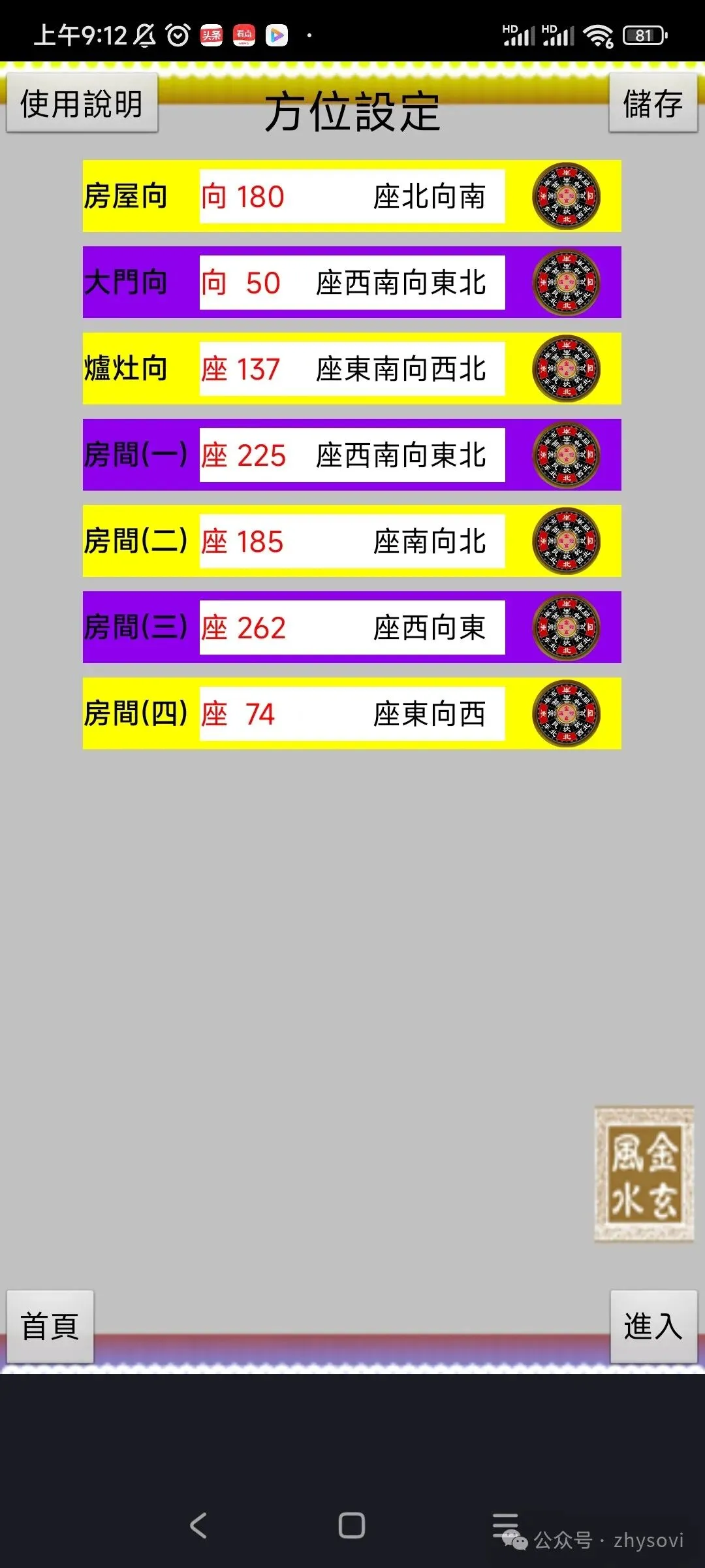 软件带有电子罗盘功能,能自动或手动测方向,能根据测的屋向,门向,灶向,房间向,给出详细的分析和建议。
