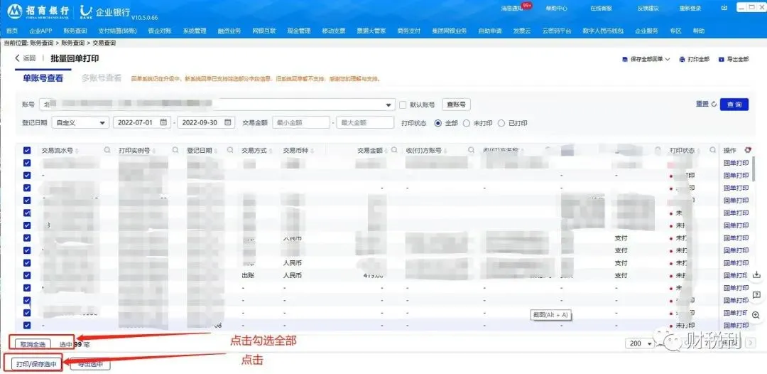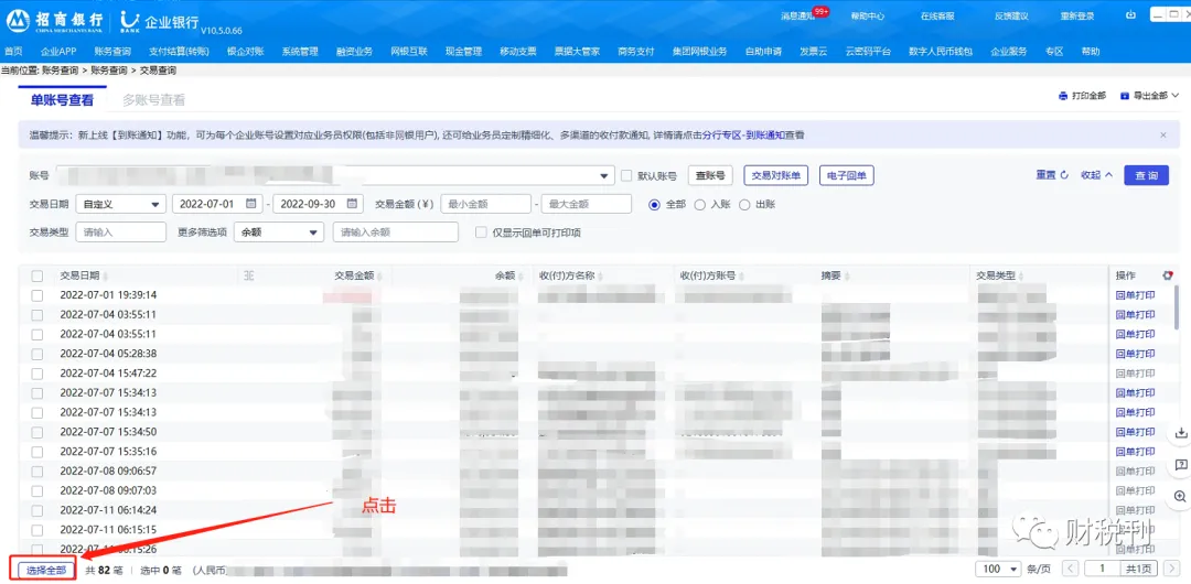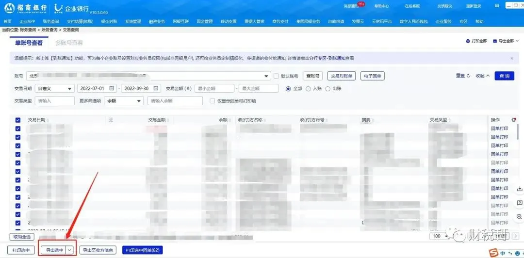 点击“账务查询(有的企业进去界面显示是账户管理)-账务查询-交易查询”后,输入要查询的起止日期,核对要查询的账号信息,确认无误后点击“查询”按钮,左下角点击“全部选择”进行勾选,然后点击“导出选中”按钮,选择自己要下载的文件类型后(在本人这里记账报税的下载成Excel格式,点击”下载为Excel")点击进行下载,选择文件要保存的位置后,点击“保存”文件就下载完成了。