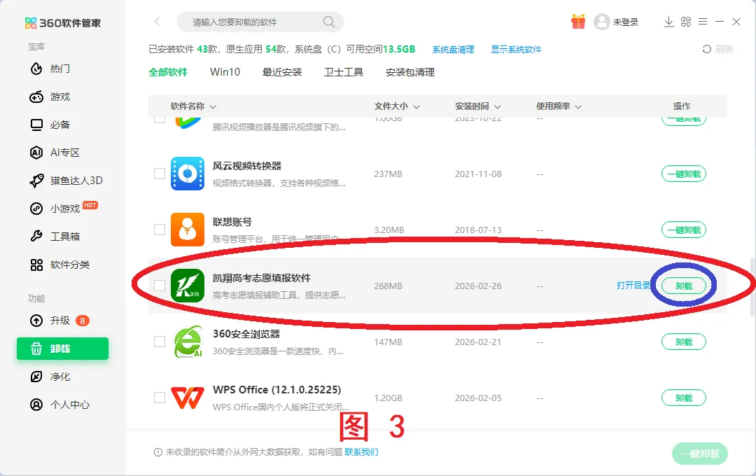 4.在图3中,向下滚动鼠标,找到“凯翔高考志愿填报软件”,然后点击右侧的“卸载”。
