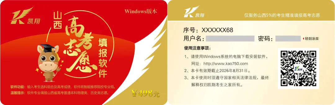凯翔卡正面印刷卡的价格498元,背面印刷使用《凯翔本科志愿填报软件》的用户名和密码。买卡、买软件实际上是一个意思,就是买个使用软件的用户名和密码。