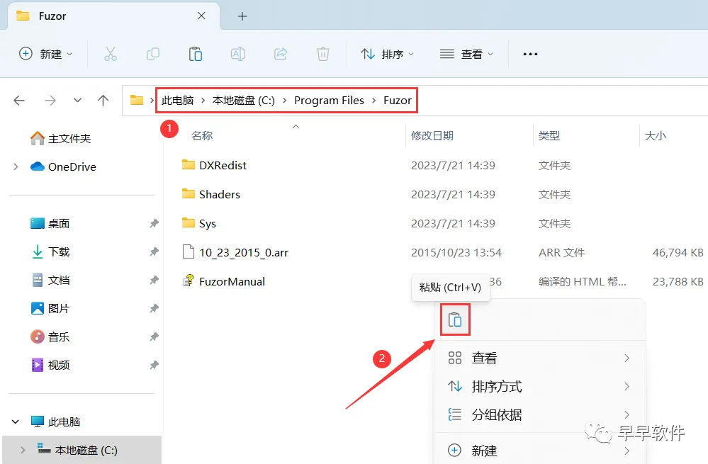 6、打开路径:D:\Program Files\ Fuzor,再右键文件夹的空白处,点击【粘贴按钮】