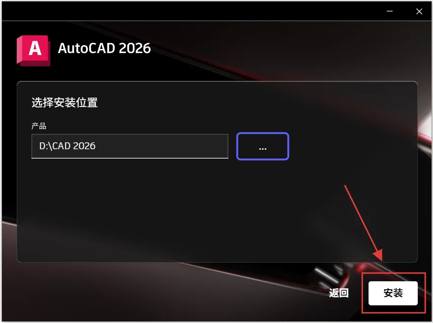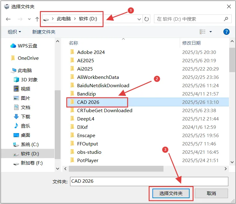 7.可以在D盘新建一个【CAD2026】文件夹,选中然后点击【选择文件夹】。(注意!安装路径和文件夹命名不要有中文.)
