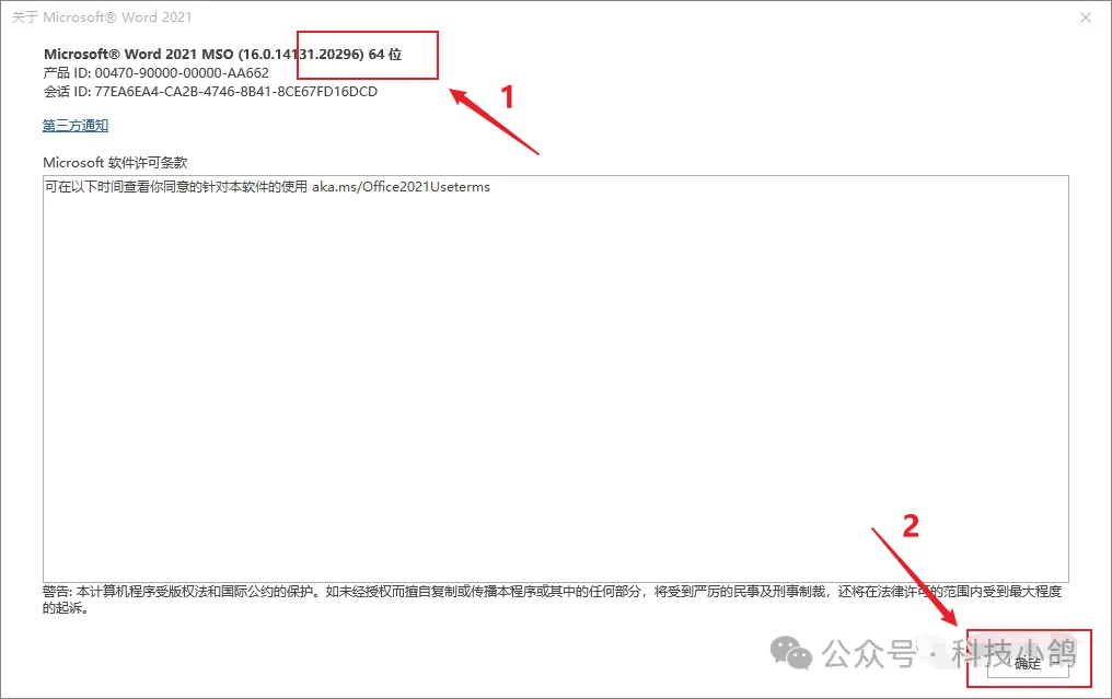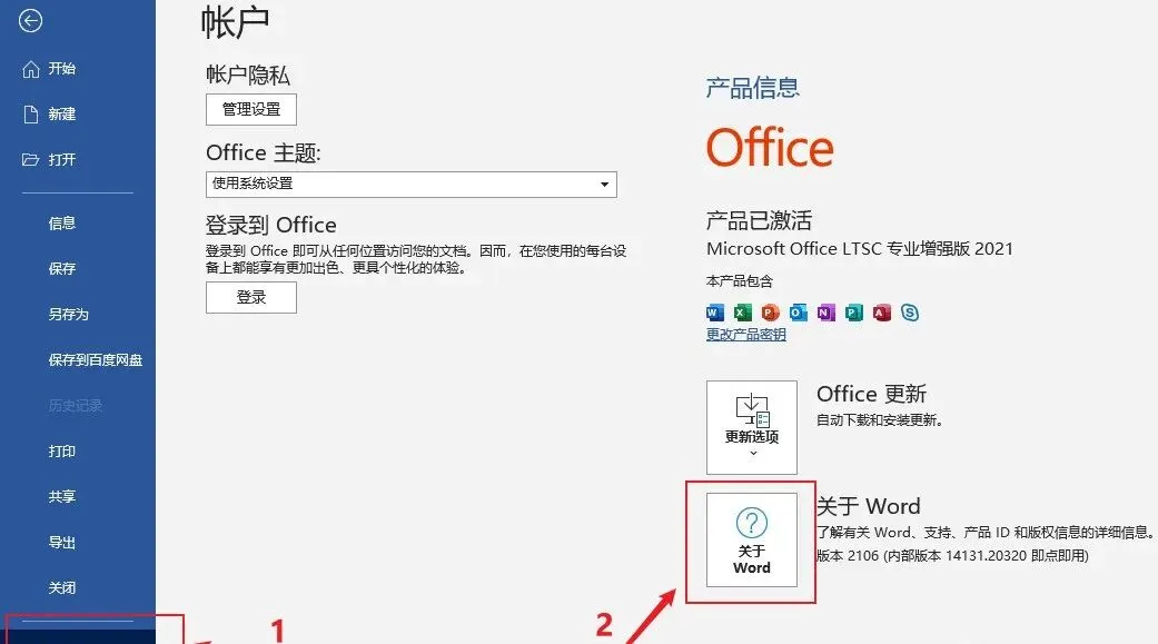 新建Word,点击MathType加载项(无论是否是灰色都要修正);❶点击【账户】,❷点击【关于Word】,查看电脑操作系统位数32位/64位,点【确定】退出;