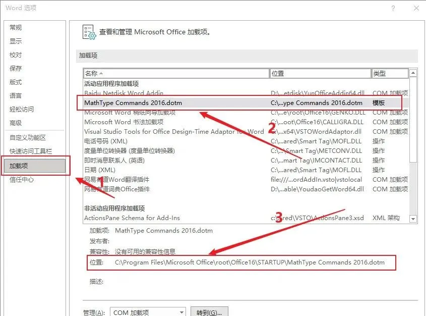 点击【文件】、【选项】,❶点击【加载项】,❷点击【MathType Commands2016.dotm】,查看所在位置,点【确定】退出,温馨提示:关闭Word,找到位置下的MathType Commands 2016.dotm,删除;