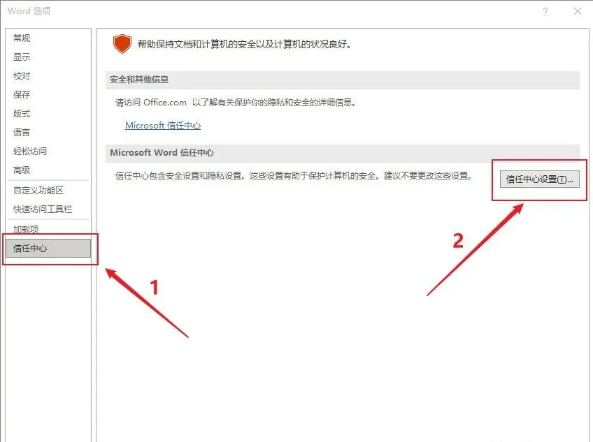 重新打开Word文件,点击【文件】、【选项】,❶点击【信任中心】,❷点击【信任中心位置】;