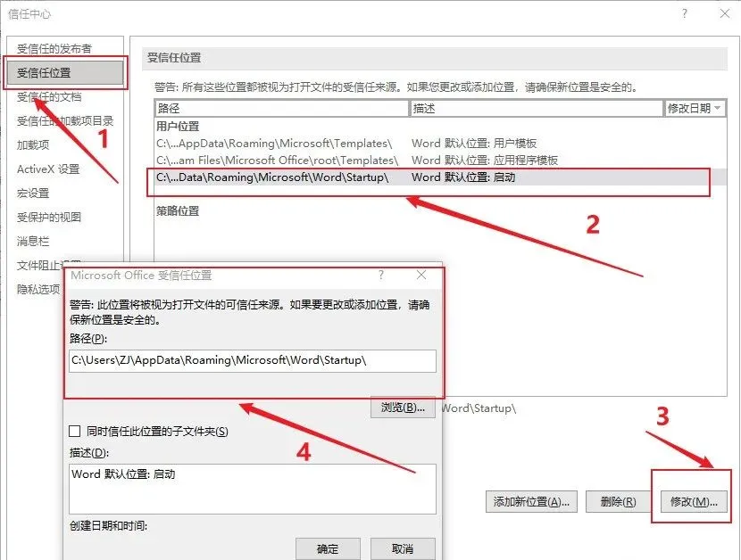 ❶点击【受信任位置】,❷点击【Word默认位置:启动】,点击【修改】,复制所在位置至【此电脑】,打开着文件夹;