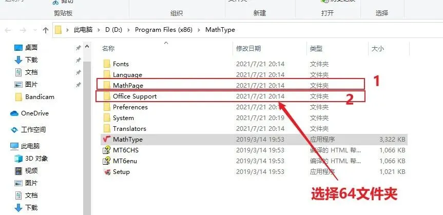 温馨提示:关闭Word文件进行接下来的操作。❶选中、右击【MathType7】,❷点击【打开文件所在位置】,打开Mathpage文件夹,按照电脑的操作系统选择32/64位操作系统,然后复制MathPage.wll到之前打开的文件夹中。同样,打开Office Support文件夹,选择相对应操作系统的文件夹,复制MathType Commands2016.dotm到之前打开的文件夹中;