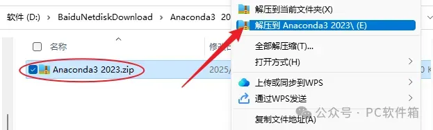 1.解压安装包:鼠标右击【Anaconda3 2023】压缩包,选择电脑上安装的解压软件,点击解压到【Anaconda3 2023】。
