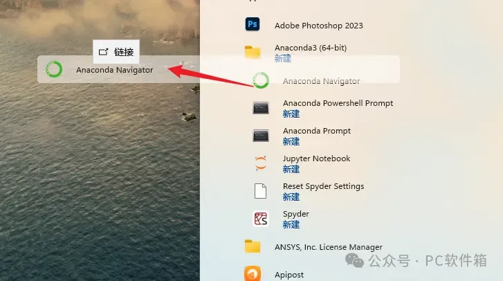 13.创建桌面快捷方式:点击桌面任务栏中的【开始图标】>点击【所有应用】>双击展开【Anacond3(64-bit)】文件夹,将【Anaconda Navigator】图标拖到电脑桌面。